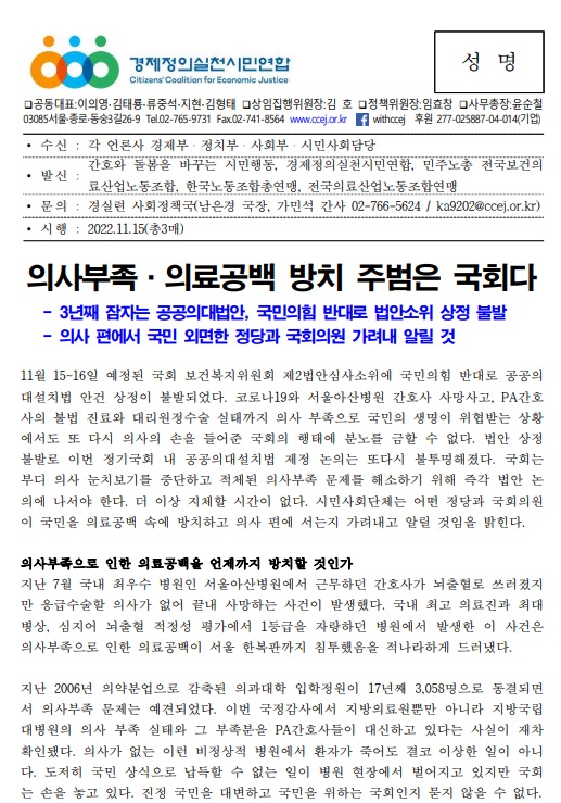 경제정의실천시민연합(경실련), 전국의료산업노동조합연행, 한국노동조합총연맹, 간호와 돌봄을 바꾸는 시민행동 등 4개 시민사회단체는 15일 '의사부족·의료공백 방치 주범은 국회다'란 제목의 성명을 내고 문제점을 짚었다.