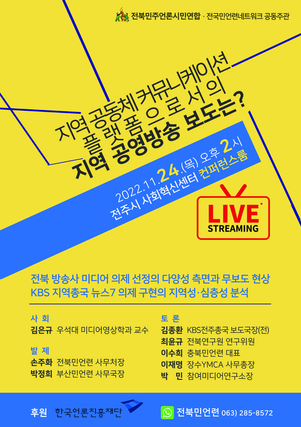 또한 이번 세미나는 전북민언련과 전국민언련네트워크가 공동 주관하고 한국언론진흥재단 후원으로 개최되며, 이날 오후 2시부터 4시까지 온라인 '말하랑게TV (전북민언련 유튜브 채널)'로 생중계 될 예정이다.