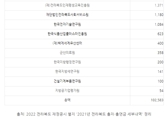 출처: 2022 전라북도 재정공시 별지 '2021년 전라북도 출자‧출연금 세부내역' 정리