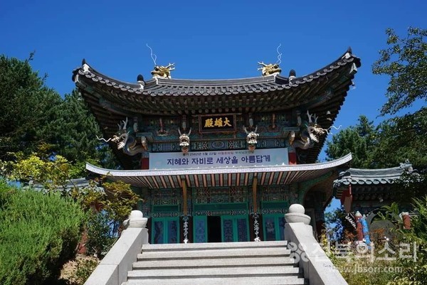 능원사 용화전 지붕의 용마루 양쪽 머리에 있는 금시조(金翅鳥) 상은 동자승을 태우고 용을 부리는 상으로 되어 있습니다. 이 새는 매우 커서 한번 날개를 펴면 두 날개의 길이가 수백 만리이고 용을 잡아먹고 산다고 합니다. 이쯤 되면 많은 분들이 장자(莊子)에 나오는 저 먼 북쪽 깊고 어두운 바다에 ‘곤(鯤)’이라는 커다란 물고기가 사는데, 이 물고기가 새로 변하여 하늘로 솟구쳐 날아오르면 ‘대붕(大鵬)’이라는 새가 된다고 나오는 장면을 연상하실 겁니다.
