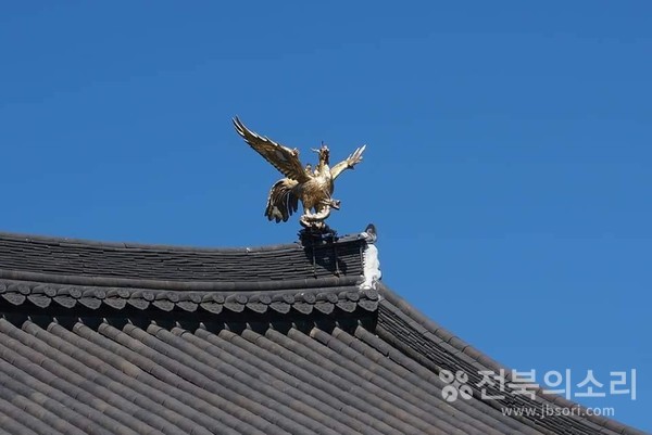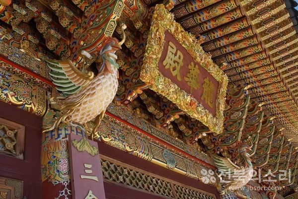 그러나 용의 벽화나 용의 조각상이 없는 사찰에는 금시조를 벽화를 그리거니 금시조 조각상을 지붕 위에 설치하는 것 같습니다. 삼각산 아래 도봉사란 사찰에는 용의 조각상으로 대웅전을 장식한 반면, 그 아래에 있는 능원사란 사찰은 지붕 위 양 쪽 난간에 금시조 상을 올려놓았습니다. 금시조가 있는 사찰에는 또한 전설상의 새인 봉황새 조각상도 같이 설치하는 걸 보았습니다.