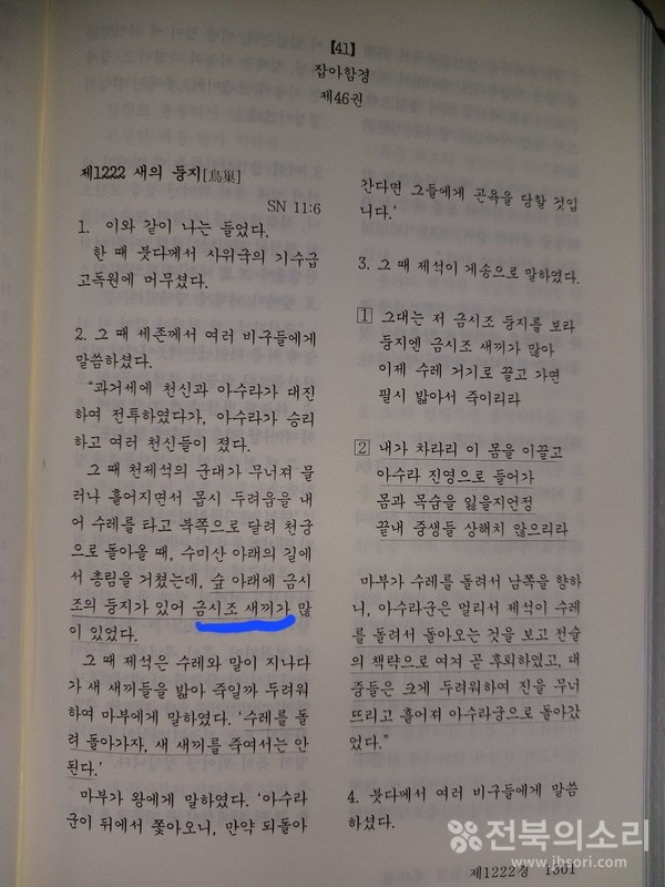 초기 경전인 잡아함경에 보면 하늘의 왕인 제석천왕이 자신의 군사들이 모는 수레가 금시조 새끼의 둥지를 밟아 죽일까봐 걱정이 되어 적에게 죽을 위험을 무릅쓰고도 군사를 되돌릴 정도로 아꼈던 새로 나옵니다. 그런가 하면 화엄경에서는 인도의 신화에 나오는 상상의 큰 새로 ‘가루라(迦樓羅)’라고 음역(音譯)한 이름으로 나옵니다.