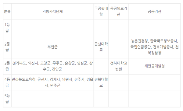 전라북도 공공기관들의 평가를 살펴본 결과 최하위인 5등급을 받은 곳은 없었지만, 1등급을 받은 곳도 없었는데요, 지역 언론들은 일부 기관과 자치단체를 제외하고 하위권 평가를 받았다고 보도하고 있습니다. 전체적으로 전북 소재 공공기관들은 대부분 2등급으로 상대적으로 높은 평가를 받은 반면, 지방자치단체들은 부안군을 제외하고 3~4등급으로 상대적으로 낮은 평가를 받았습니다.