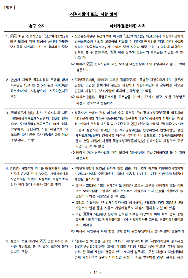 3. 전라북도가 회관 신축사업에 다른 사업(정읍체육트레이닝센터 건립) 명목으로 도비(특별조정교부금) 10억 원을 교부하고, 정읍시가 이를 재원으로 시 보조금 10억 원을 추가 편성한 것은 위법․부당하다는 주장