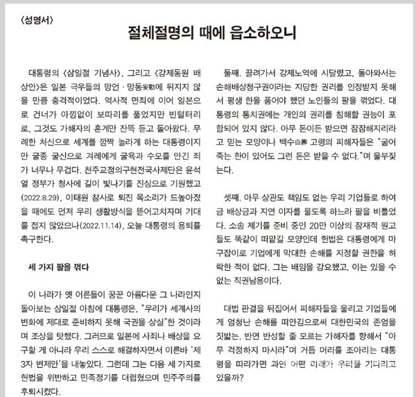 또한 윤 대통령의 최근 일본 방문과 관련해 “이 나라가 옛 어른들이 꿈꾼 아름다운 그 나라인지 돌아보는 3·1절 아침에 대통령은 ‘우리가 세계사의 변화에 제대로 준비하지 못해 국권을 상실’한 것이라며 조상을 탓했다”며 “그러므로 일본에 사죄나 배상을 요구할 게 아니라 우리 스스로 해결하자면서 이른바 ‘제3자 변제안’을 내놓았다”고 비판했다.