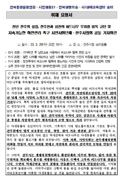 - "전주천·삼천 버드나무 벌목 논란, 우범기 전주시장은 시민들에게 사과하고 대화에 나서야"