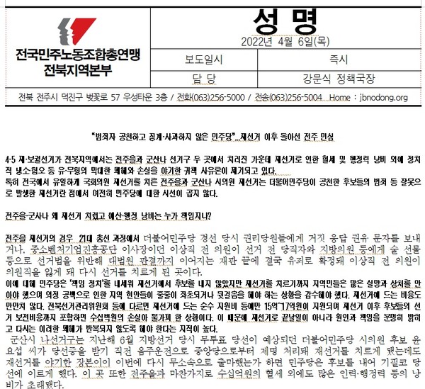 이에 대해 전국민주노동조합총연맹 전북지역본부(민주노총 전북본부)는 6일 성명을 통해 “그동안 전북에서 더불어민주당의 행보는 국민의힘과 차별점을 갖지 않았다”며 "나쁜 일자리는 넘쳐나고 청년들은 지역을 떠나는 전라북도의 암울한 현실은 전적으로 수십년간 전북 여당이었던 더불어민주당의 책임이다”고 전제했다.