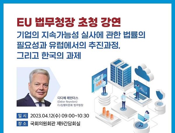 필자는 4월 12일 국회의원회관 제9간담회실에서 개최된 EU 집행위원회 법무청장 '디디에 레인더스'의 강연을 들었습니다. '디디에 레인더스' 법무청장은 기업의 지속가능성 실사에 관한 법률의 필요성과 유럽에서의 추진과정, 그리고 한국의 과제에 대한 강연을 하였습니다.