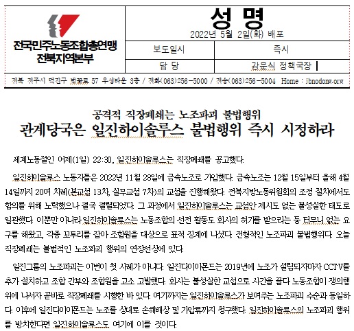 이어 성명은 "여기까지는 일진하이솔루스가 보여주는 노조 파괴 수순과 동일하다"면서 "이후에 일진다이아몬드는 노조를 상대로 손해배상 및 가압류까지 청구했다. 일진하이솔루스의 노조 파괴 행위를 방치한다면 일진하이솔루스도 여기에 이를 것"이라고 강조했다.