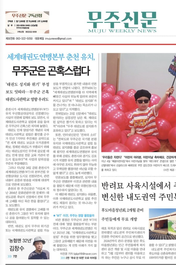 [무주신문] 세계태권도연맹본부 춘천 유치, 무주군은 곤혹스럽다(5/8, 1면, 2면, 이진경)