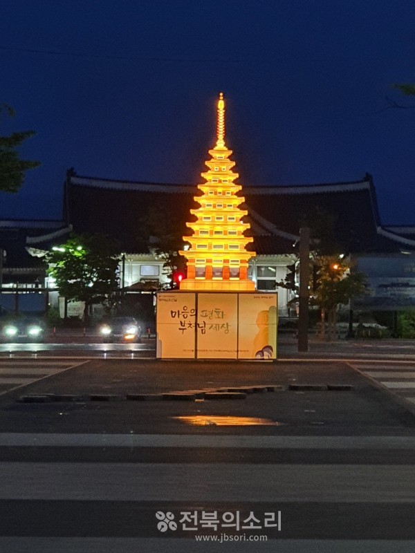 오는 27일은 '부처님 오신 날'입니다. 전주역 앞에 부처님 오신 날을 맞아 미리 세워진 평화 봉축탑과 주변의 자비로운 야경을 담은 사진입니다.