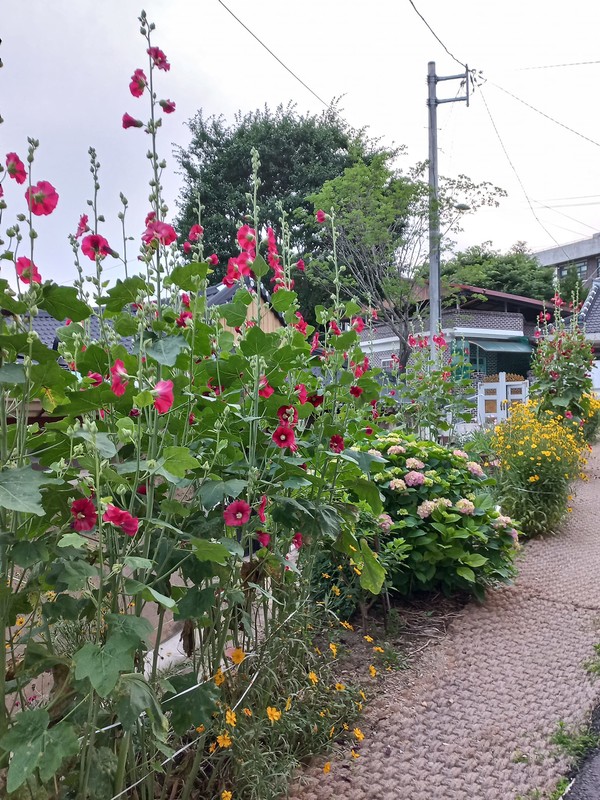 '언제 이렇게 많은 꽃을 심으셨냐'고 물었더니 '꽃을 좋아한다'고 말씀하십니다. 엊그제 지나다 다시 보니 접시꽃들이 붉게 피었고, 수국도 곱네요. 이 분이 안 계셨으면 삭막했을 골목인데 꽃밭이 되었습니다.