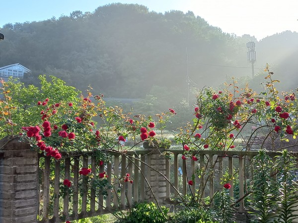 아침에 일어나서 꽃을 보러 가면 새 소리도 들리고 기분 좋게 하루를 시작합니다. 시들지 말라고 물도 줍니다. 이제는 아이들이 별로 없는 놀이터에서 어르신이 운동을 하며 꽃을 보십니다. 활짝 웃으시는 얼굴이 장미꽃을 닮았습니다.