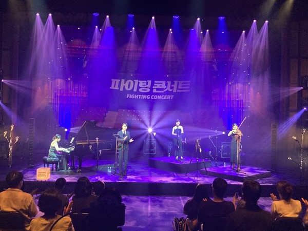 그제서야 '아! 오늘 우리가 보는 공연도 바로 그 파이팅 콘서트 구나.'라는 생각이 들었습니다. 파이팅 콘서트는 2020년 코로나19로 수많은 공연들이 취소 되고 거리두기로 공연장에 관객들도 적게 입장하고, 공연을 해야 하는 아티스트들이 설 무대가 없었을 때, 한국소리문화의전당이 코로나19 장기화로 힘든 나날을 보내고 있는 도민들을 위로하고, 공연 취소로 경제적 어려움을 겪고 있는 지역예술인들에게 무대에 설 기회를 제공하는 한편 공연료와 무대영상 제작 지원을 하는 온라인 콘서트 기획 프로그램이었습니다.