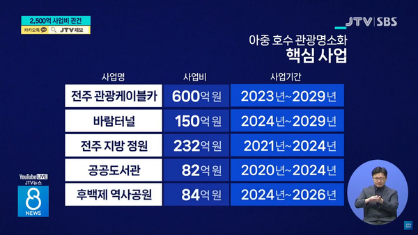 22일 우범기 전주시장이 전주 아중호수에서 현장 브리핑을 통해 관광명소화 사업을 추진한다고 밝혔습니다. 지난 4월 발표했던 왕의 궁원 프로젝트의 일부인데요, 2032년까지 10년 동안 약 2480억 원을 투입해 총 21개 사업을 진행할 계획입니다. 그러나 일부 지역 언론은 예산 확보에 대한 우려와 함께 특히 케이블카 설치에 대한 논란이 예상된다며 주목하고 있습니다.