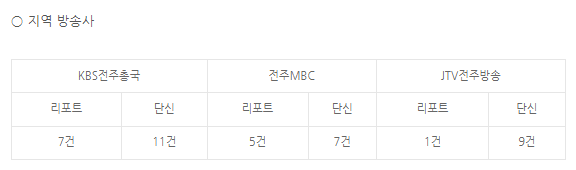 KBS전주총국이 리포트 7건, 단신 11건으로 관련 보도가 가장 많았고, JTV전주방송이 리포트 1건, 단신 9건으로 관련 보도가 가장 적었습니다. 특히 리포트 기사에서 다른 두 언론과 큰 차이를 보였는데, 7월 3일 리포트 보도 이후 관련 보도를 전부 단신으로 보도했습니다.