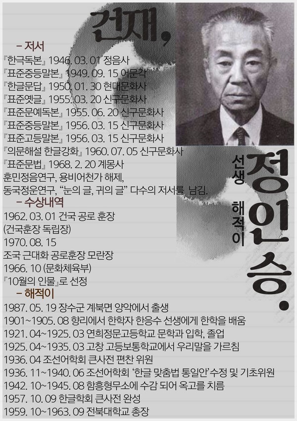 어떻게 지켜온 우리 한글인가? 한옥, 한식, 한지, 판소리 등 한류와 한스타일의 종가집 격인 우리 전북은 한글 수호와 한글 사랑 역사에서도 주류였다. 장수출신 한글학자 건재 정인승(1897~1986) 선생은 당시 남고창 북오산이라는 별칭처럼 남한 최고의 민족학교인 고창고보에 교사로 재직하며 말이 곧 민족이란 인식 하에 민족 혼을 불어넣는 교육을 했다.