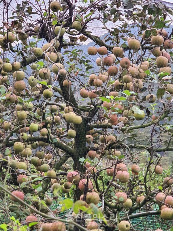그런데 지리산 아래 어느 시골 마을 작은 텃밭에 심어진 사과나무에는 과일이 주렁주렁 풍성하게 열려 있어 보는 눈을 풍족하게 해줍니다. 풍성하고 여유로운 수확의 계절이 되기를 바랍니다.