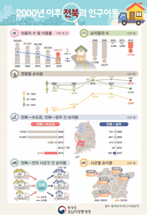 호남지방통계청 사회조사과가 7월 26일 발표한 '2000년 이후 20년간(2000~2019) 전라북도 인구이동 추이'에 따르면 지난해 전북의 총 이동자 수는 22만 9,000 명으로 20년 전(35만 1,000 명)에 비해 34.8% 감소했다. 이동률 역시 지난해 16.5%로 20년 전에 22.7%였던 것에 비해 6.2%p 하락했다.