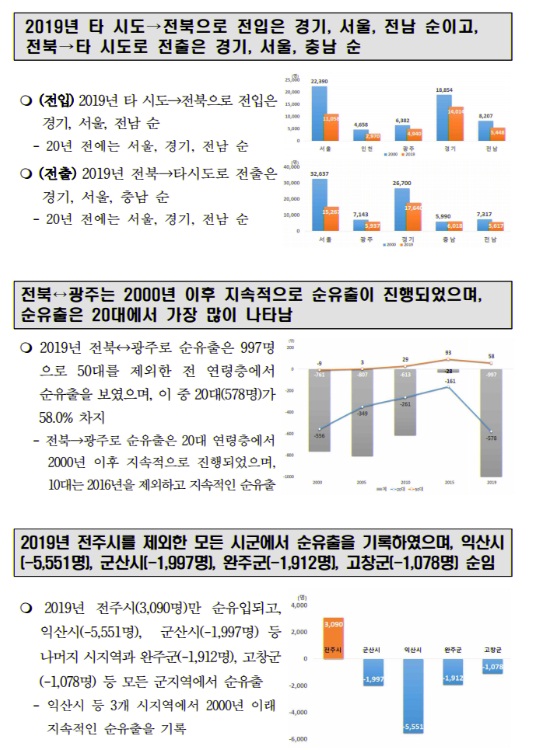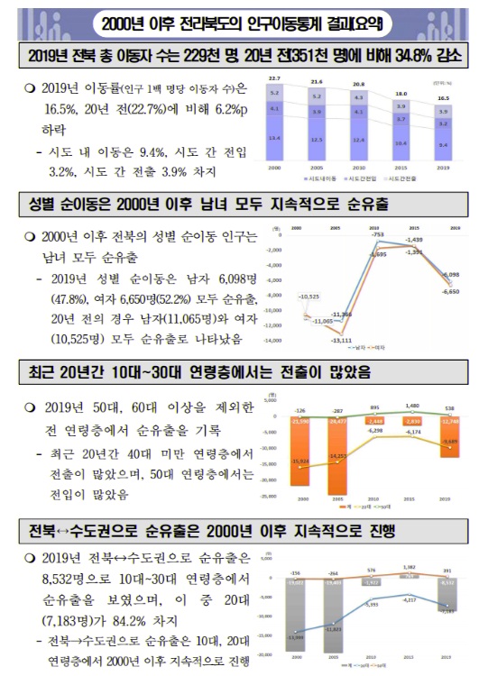 무엇보다 최근 20년간 10대~30대 연령층에서는 전출이 많았다는 점, 전북에서 수도권으로 순유출은 10대, 20대 연령층에서 2000년 이후 지속적으로 진행되고 있으며, 주로 20대에서 가장 많이 나타나고 있다는 점은 전북의 미래를 더욱 암울하게 한다.