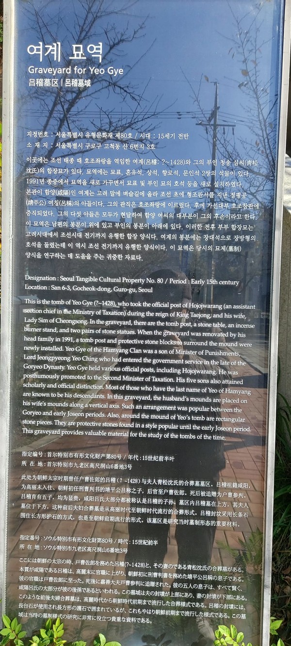 역시 가을이 사뭇 반겨지는 것은 신선한 날씨 때문 만은 아닌 것 같습니다. 오늘도 공원을 지나 동네 뒷산 오솔길을 걸어 반대편으로 하산하는데 그곳에는 조선 초기 문인 여계(呂稽) 선생의 묘역(서울시 유형문화재 제80호)을 만났습니다. 오늘은 벌초를 하는 날이라 개방되어 들어가 보니 여계 선생과 부인의 묘소의 배치가 일반적으로 나란히 두 부부의 묘를 쌍봉으로 모시는 경우와 달리 앞뒤로 모셔져 있었습니다.