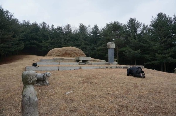 그것도 부인의 묘가 앞에 위치하고 비석도 부인의 묘 앞에 세워졌고, 남편의 묘는 뒤에 위치하고 묘 앞에는 비석 하나 없는 특이한 형태였습니다. 벌초를 하시며 묘역을 관리하시는 분들도 모르고 계셨다가 제가 말씀을 드리는 그제서야 묘비를 읽어 보시더니 그렇다고 하십니다.