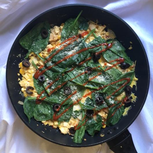 재료 : 시금치 1/3단, 양파 1/2개, 두부, 달걀 4개, 스위트콘, 파마산 치즈, 올리브 5알, 후추