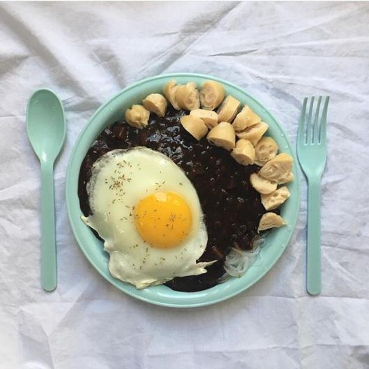 재료 : 실곤약, 3분 짜장, 달걀 1개, 닭가슴살 소시지, 식초 1스푼, 갈릭시즈닝