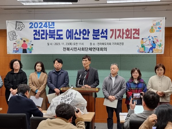 23일 전북시민사회단체연대회의가 기자회견을 통해 2024년 전라북도 예산안 분석 결과를 정리해 발표했습니다. 예산안에 대해 문제점을 지적하고 전문가 토론회와 공청회 등을 통해 예산안 심의에 도민들의 참여를 보장할 수 있는 의견 수렴을 해야 한다고 주장했는데요. 민생과 관련된 예산들이 크게 줄어들었기 때문입니다.