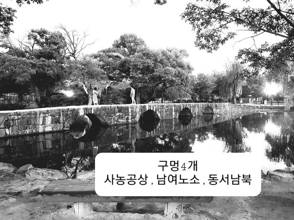 칠월 칠석날 견우와 직녀가 만나는 지점이라는 그 표시점은 광한루의 중심 축이다. 그 곳을 지나는 사람마다 유토피아로 들어가는 주인공이 되기 때문이다. 오작교의 다리 구멍은 처음에 3개였다. 사람은 하늘과 땅과 같다라는 이상향의 천지인 합의 사상을 오작교에 들였고 그 사상의 숙성기를 지나 조선백성의 염원인 백성이 나라의 근본사상을 오작교에 들이는 오작교 구멍 4개로 확장 되었다.