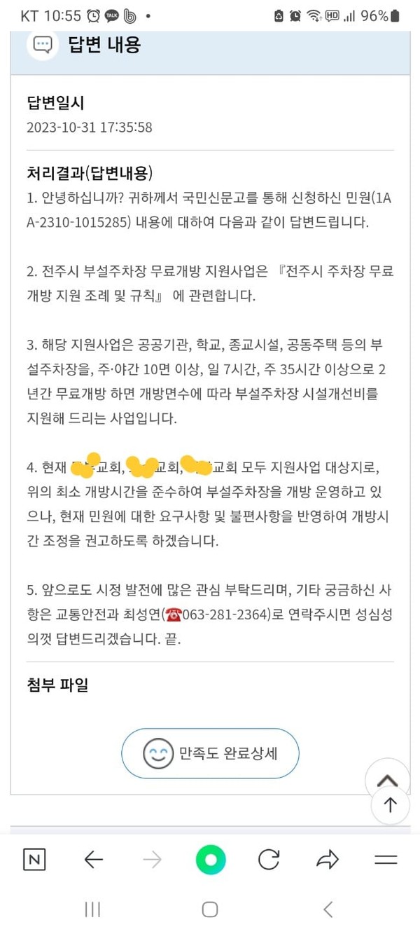 중노송동에 있는 ㄹ교회 주차장은 7시~18시 까지 개방한다고 써있기에, 개방하는 시간을 조정할 수가 있을지 궁금하여 지난 10월 25일 전주시청에 <전주 도심 교회의 주차장을 개방하는 시간을 조정해주시기 바랍니다.> 라는 민원을 넣었습니다.