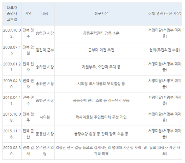 전라북도 관련 사례도 찾아봤는데요. 다음과 같이 총 8건입니다. 전부 서명부를 제출하지 못했거나 철회된 사례로, 서명부를 실제로 제출한 건 올해 최경식 남원시장 사례가 처음입니다.