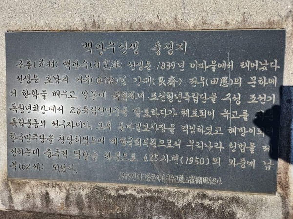 헌법전문은 "대한민국은 3·1운동으로 건립된 대한민국 임시정부의 법통 ᆢ"으로 시작한다. 3·1운동의 불을 지른 도화선이 2·8독립선언이고, 그 주역이 바로 근촌 백관수다. 한국 근현대사의 빛나는 한 쪽을 쓰신 거인이다. 다시 기억해야 할 독립운동가다. 백관수는 고창 성내면 생근리 출신이다. 아호 근촌은 미나리가 많이 나던 고향마을 생근리의 미나리 근자를 따서 지은 걸 보면, 그는 천상 고창 사람이다.