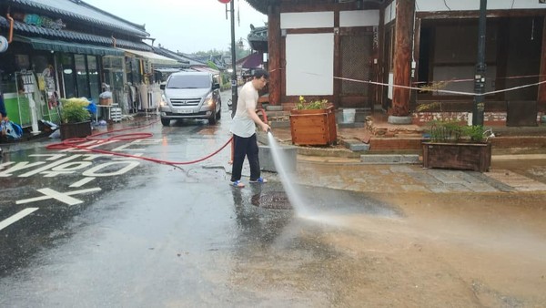 비오는 중에도 관광객들은 있기에 그들의 안전을 위해 흙탕물이 남기고간 흙까지 정리해야 합니다.