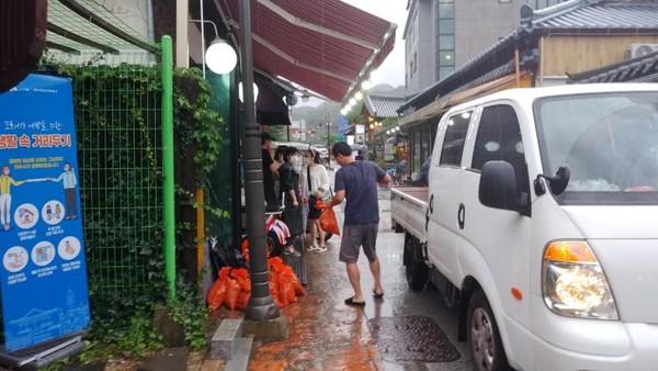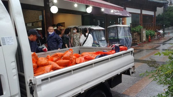 모래주머니로 더 내릴 비를 대비합니다. 그렇게 무사히 하루를 보냈지만 오늘(9일)도 일부 직원이 나와 시설 점검 및 호우 대비 중입니다. 한옥마을을 지키기 위해서입니다.