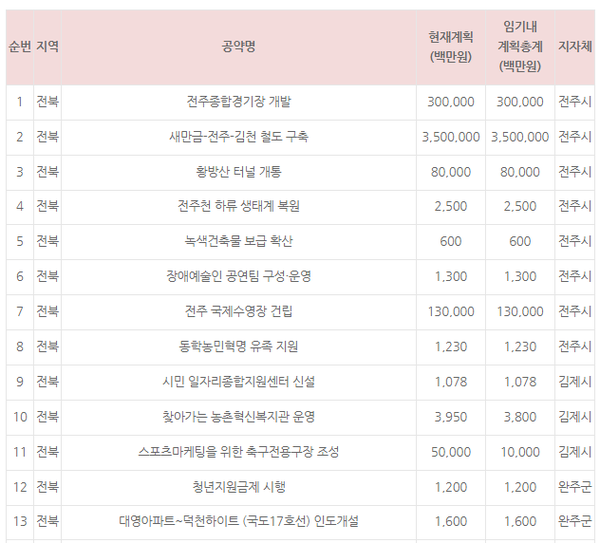 한편 전체적인 공약 이행 완료율은 전국 꼴찌였지만 SA등급을 받은 지자체는 익산시, 남원시, 완주군, 장수군, 순창군, 부안군 등 6곳, A등급을 받은 곳은 정읍시와 고창군 등 2곳이었습니다.