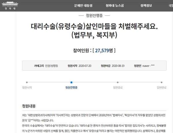 국민청원 - 대리수술(유령수술)살인마들을 처벌해주세요(법무부, 복지부).