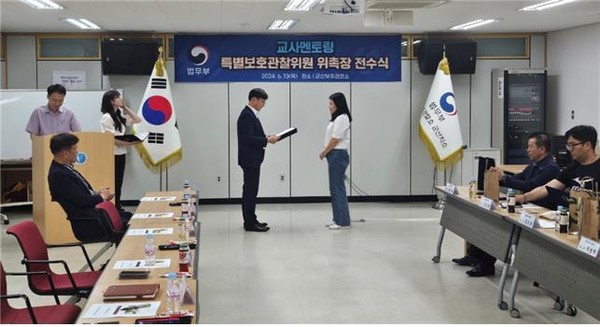 군산보호관찰소(소장 조영술)는 13일 전북특별자치도교육청 소속 중·고등학교 교사 8명을 특별보호관찰위원으로 위촉하고 보호관찰제도 설명 및 보호관찰 학생 상담 경과통보서 작성 방법 등 전문화 교육을 실시했다고 밝혔다.