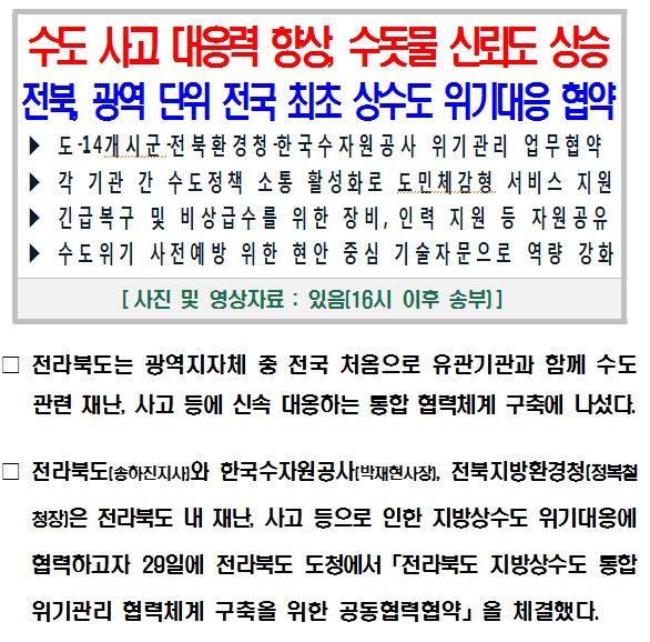 더구나 올해도 지난 7월 29일 ‘광역 단위 전국 최초 상수도 위기대응 협약 ’이란 주제의 보도자료를 통해 전북도는 '광역지자체 중 전국 처음으로 한국수자원공사 등 유관기관과 함께 수도 관련 재난, 사고 등에 신속 대응하는 통합 협력체계 구축에 나섰다”는 홍보를 대대적으로 실시한 바 있다.