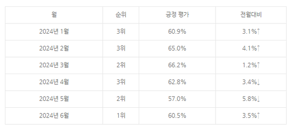 실제 2024년 6월 리얼미터의 조사 결과를 살펴보면 김관영 도지사는 긍정 평가 60.5%를 받아 지난달보다 3.5% 상승했습니다. 이외에도 올해부터 김관영 도지사가 어떤 평가를 받았는지 정리해봤습니다. 긍정 평가 수치는 매번 변했지만 모두 긍정 평가 3위 안에 드는 높은 순위를 기록했는데요. 긍정 평가 수치는 2024년 3월이 66.2%로 가장 높았지만 당시 순위는 2위였습니다. 한편 2024년 5월에 긍정 평가가 57.0%로 가장 낮았는데요, 순위는 그대로 2위로 나타났습니다.