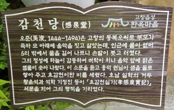 옛 흥덕현의 토반3성으로 흔히 오고류라 하여 동복오씨, 장흥고씨, 고흥류씨를 꼽는다. 동복오씨 오준(吳浚1444~1494)은 한림 오자귀의 증손으로 흥덕현(현 신림면 외화리)출신이다. 고창의 여러 효자 전승담 중에서도 효감천 이야기와 함께 대표 효자가 오준이다. 어려서부터 어머니와 아버지의 병을 고치고 연명하기 위해 갖은 효성을 다했다. 부모님 돌아가신 후에 묘 옆에서 움막을 짓고 모시는데, 주위에 샘이 없어서 멀리 가평리 뺌산까지 왕복하며 새벽마다 물을 길어다 올렸다. 마침내 하늘이 오준의 효성에 감동하여 천둥 벼락을 치며 샘을 만들어 준 것이 효감천이다. 감천선생의 효성에 감동한 호랑이가 나타나 선생을 지켜주고 제수도 가져다 주며 함께 살았다는 호랑이 감복담도 함께 전해온다.
