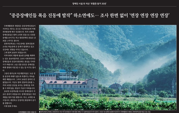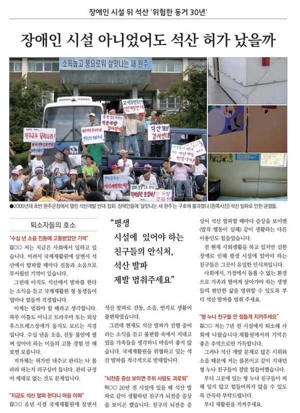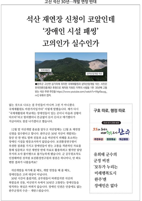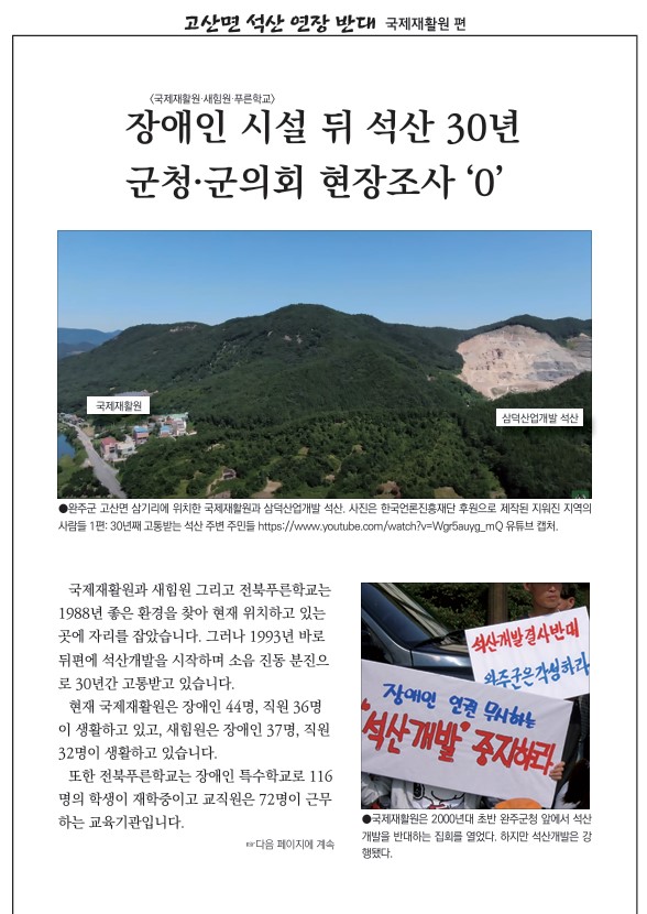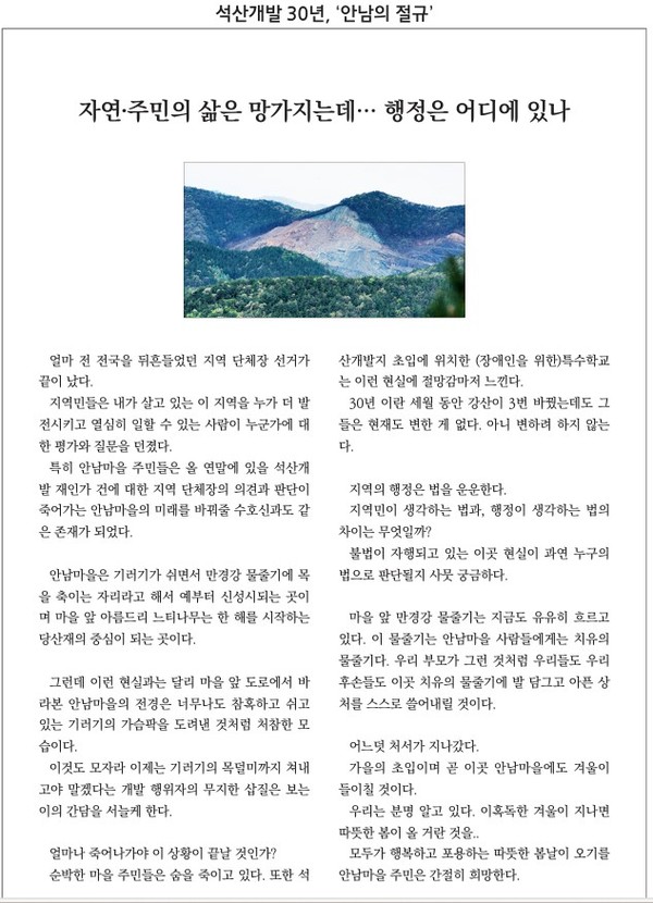 다음은 최 씨가 정성스럽게 편집·제보해 온 내용들 중 ‘고선 석선 30년, 개발 연장 반대’, ‘석산 30년 안남의 절규’, ‘장애인 시설 뒤 석산 ‘위험한 동거 30년’’ 등의 제목과 관련 내용 전문, 사진 등을 소개한다.