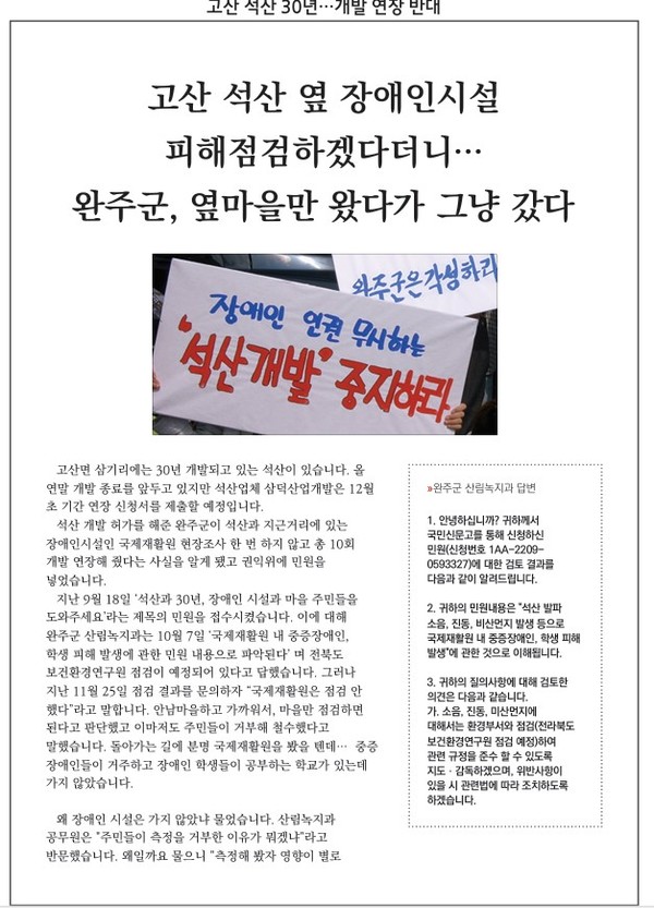 이정현 전북환경운동연합 대표는 이와 관련 “30년 이상 석산개발로 인한 피해는 비산먼지와 소음 외에도 대형 운반 트럭의 안전 문제와 소음, 먼지, 암 발생 등 각종 유해 발생 등이 크고 잦다”며 “석산 개발지 바로 옆 안남마을도 64세대 중 17명이 암으로 사망할 정도다”고 설명했다.
