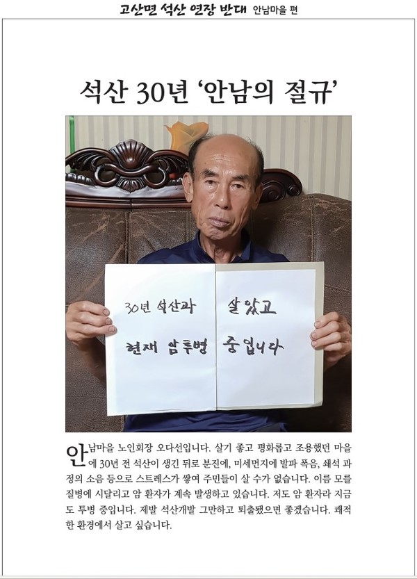 '고산 석산 30년과 개발 연장 반대'...주민 최세연 씨 제보·주장