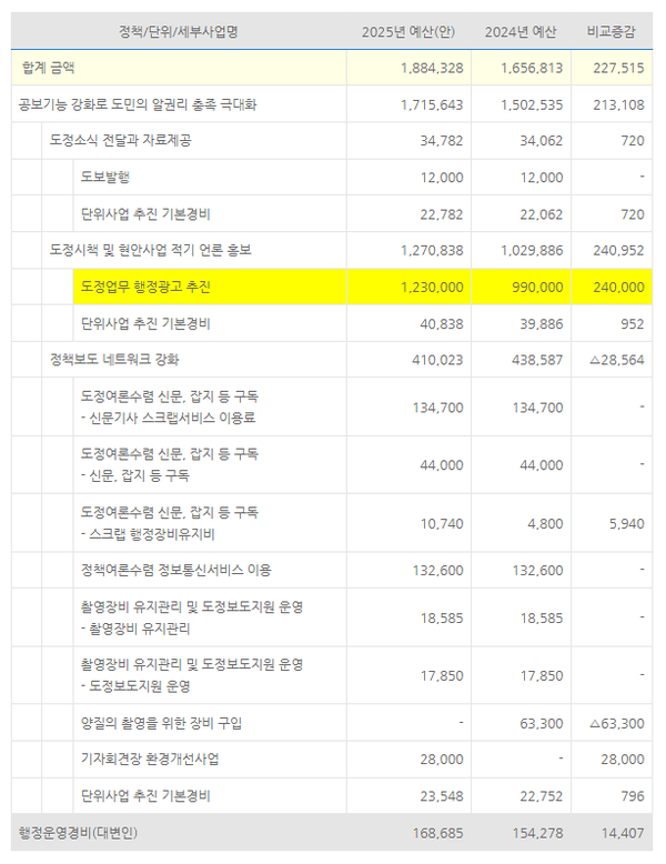 2025년 도청 본예산 세부사업 설명서를 살펴보면 대변인실이 세운 총예산은 1,884,328,000원이다. 2024년도에 비해 약 13.7% 정도 증액된 금액이다. 2024년, 2025년은 정부 세수 부족으로 교부세가 줄어 전북자치도청 부서가 전반적으로 예산을 감액하고 있으나 대변인실 예산은 증액되었으며 그중에서도 <도정업무 행정광고 추진> 항목이 증액된 것으로 확인된다. <도정업무 행정광고 추진> 항목은 일간·주간 신문, 인터넷신문, 통신사 등에 지출하는 예산으로 2024년 9억 9천만 원에서 2025년에는 12억 3천만 원, 총 2억 4천이 증액되었다.