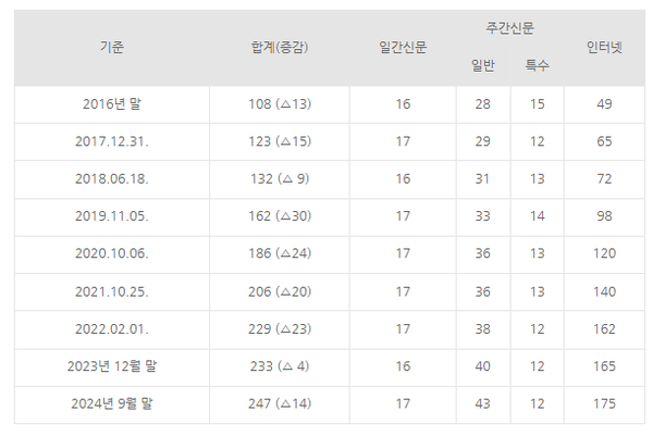 전북지역에 등록된 언론사는 24년 9월 기준으로 247개 사이며 일간신문 1개 사, 일반 주간신문 3개 사, 인터넷 언론사가 10개 증가해 23년 대비 14개 사가 증가한 것으로 확인된다.