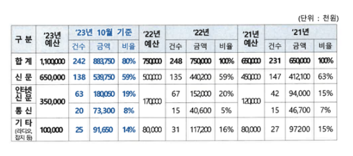 -117개 언론사에 309건 총 10억 9천만원 집행