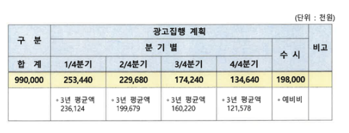 3) 2024년 집행 계획 - 광고비 집행평균(최근 3년)을 중심으로 아래와 같은 계획을 수립해 공개했다. 대변인실은 광고비의 20%(198,000천원)는 수시·현안 발생 시 지원을 위해 예비비를 책정했다고 밝혔다.