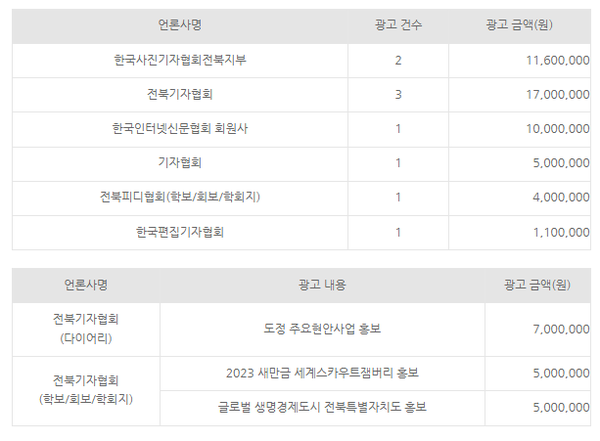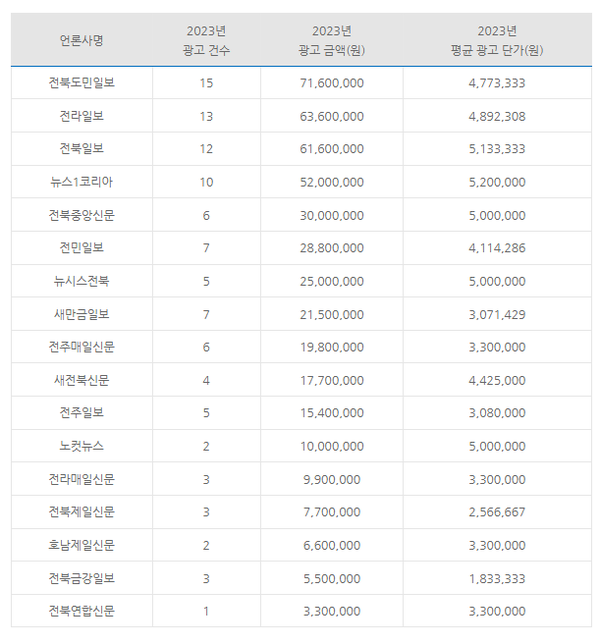 * 전북자치도청 대변인실 2023년 전북일간신문 및 통신사 광고 집행 내역