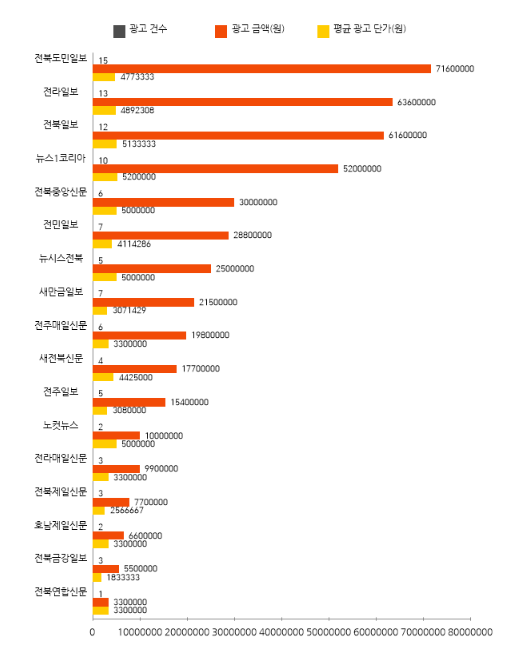 인쇄 매체 집행 건수와 금액은 지면 광고비, 언론사 주최 행사의 팸플릿·리플릿·단행본에 실린 광고, 협회에서 발행하는 회보, 대학교 내 신문사 등에 집행된 광고, 언론 단체 협회에서 운영하는 협회지 광고, 그리고 전북일보에서 발행하는 전북연감, 전북도민일보에서 발행하는 전북대관에 실린 광고비(또는 구입비)등이 포함된 집행 금액과 건수이다.
